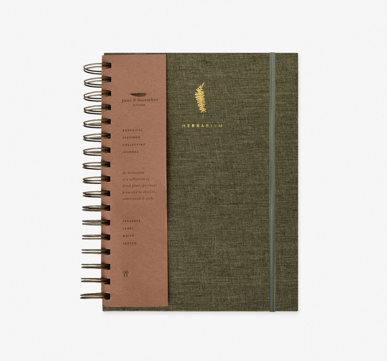Inspired by Italian botanical garden herbariums, June & December designed this linen-covered Herbarium Journal to preserve personal collections of pressed specimens as a memory keepsake. Each Herbarium is made with 100% PCW-recycled, acid-free card stock to best preserve botanical specimens for observing, studying, and remembering what makes them special. These forest green journals have a fern foil stamped cover with patterned inside cover details and printed pages to label, journal, or sketch.