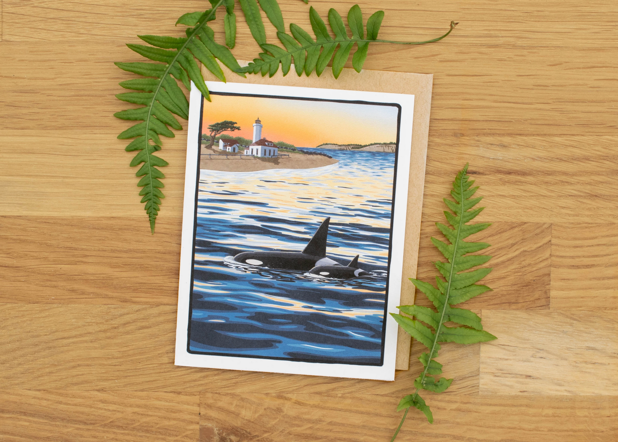 These greeting cards of original watercolor illustration from Laurel Mundy of a Tufted Puffin in their habitat is printed in her home studio, reproduced in vibrant colors on high quality archival matte paper. Each card is paired with a 100% recycled kraft brown envelope.
